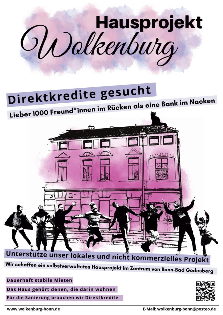 Für die Sanierung des Hauses sind wir weiterhin auf der Suche nach privaten Darlehen, denn je mehr Direktkredite wir zur Verfügung haben, um so besser können wir das Haus nachhaltig instandsetzen. Außerdem müssen wir bis zum Sommer 2026 Direktkredite über 100.000€ ablösen. Dafür suchen wir weiterhin Menschen, die unser solidarisches Wohnprojekt auch finanziell unterstützen möchten.